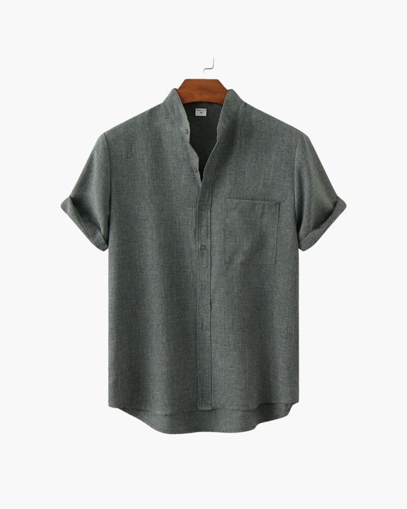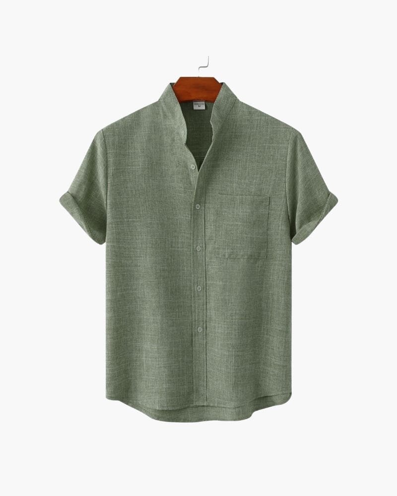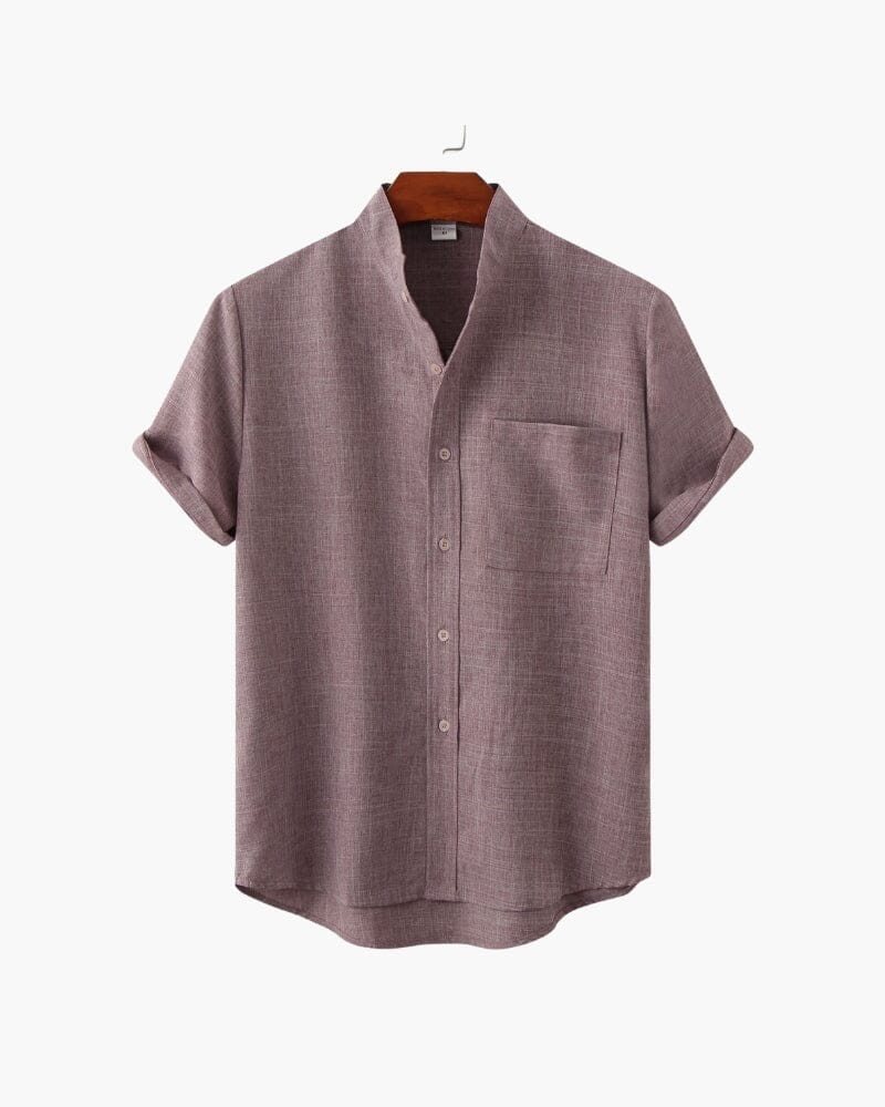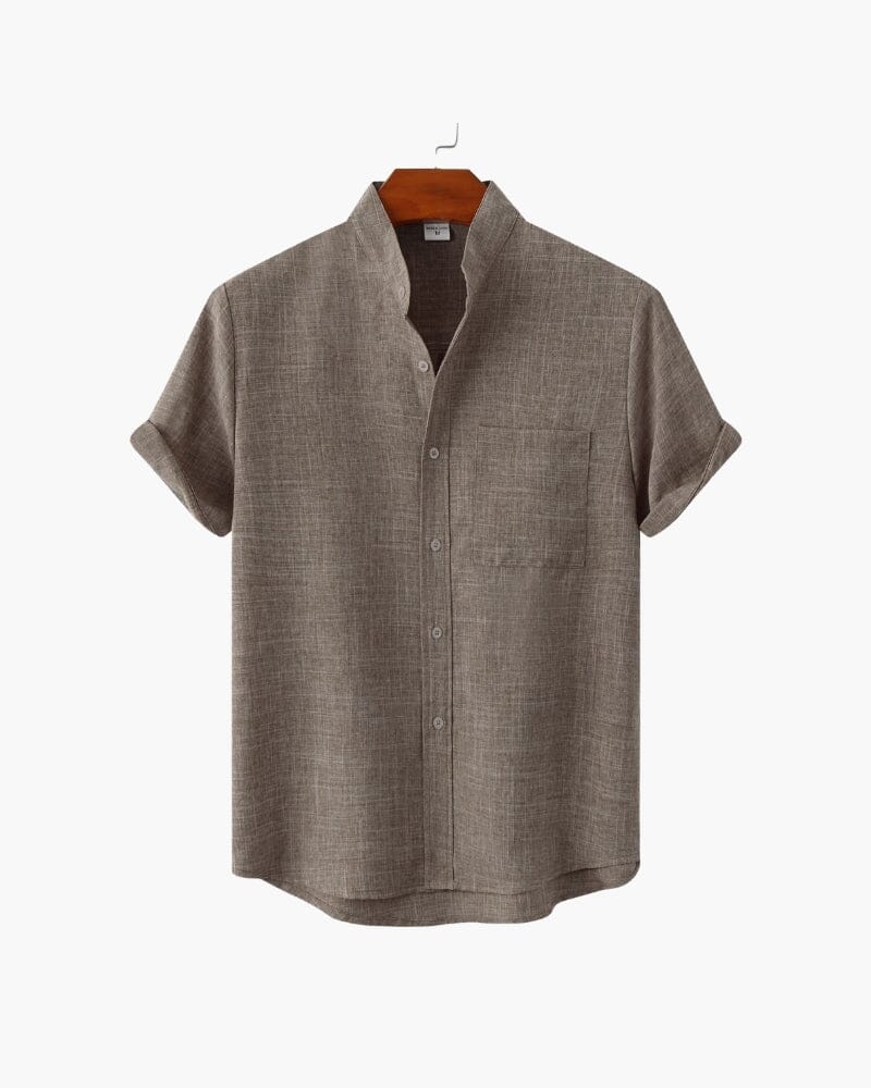 A perfect blend of modern ease and classic refinement, this mandarin-collar shirt exudes quiet sophistication. Its breathable fabric and relaxed silhouette make it an essential for warm-weather styling, whether layered under a blazer or worn solo for a polished off-duty look. Rolled sleeves and subtle texture add depth, making it a go-to for understated elegance.