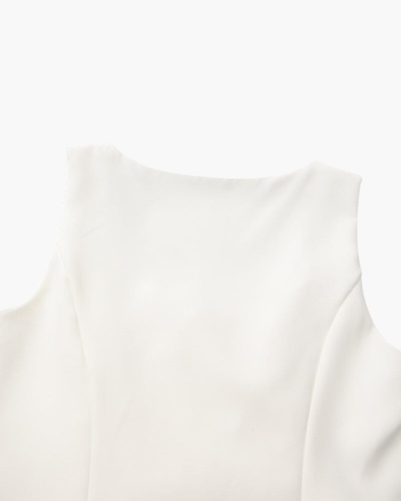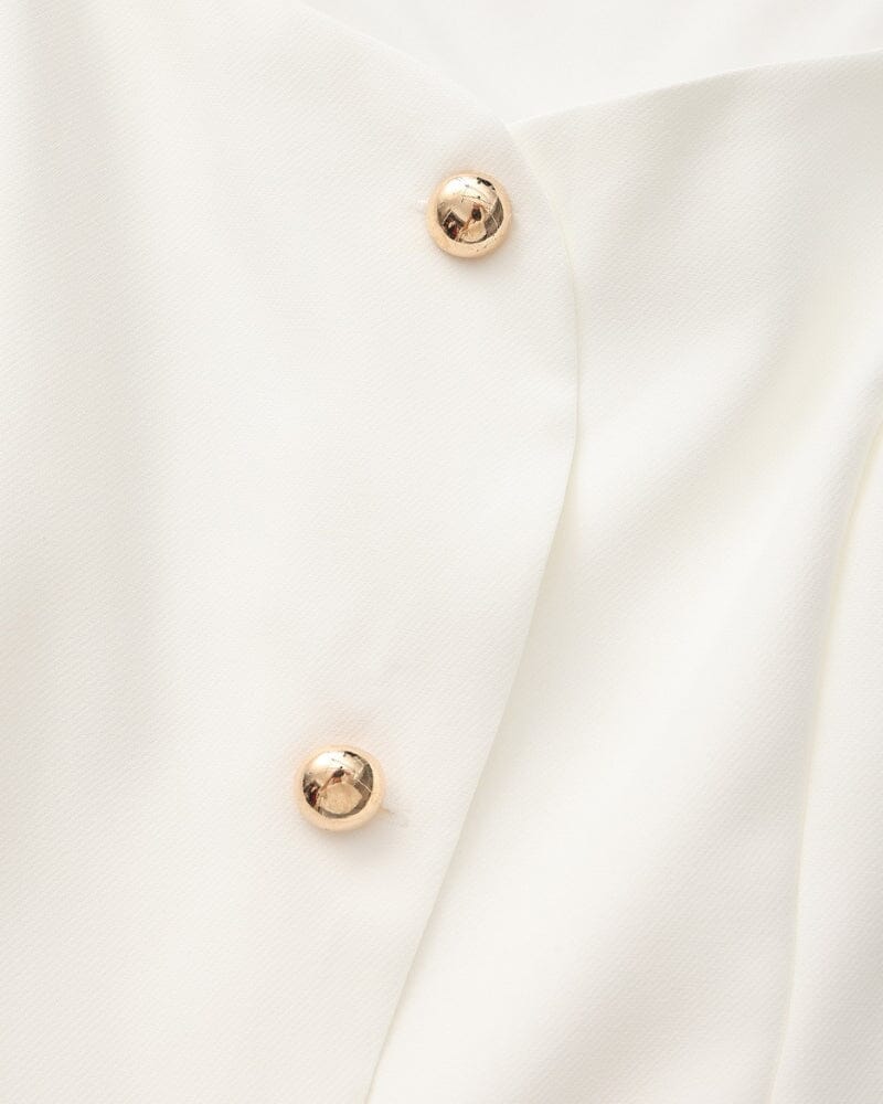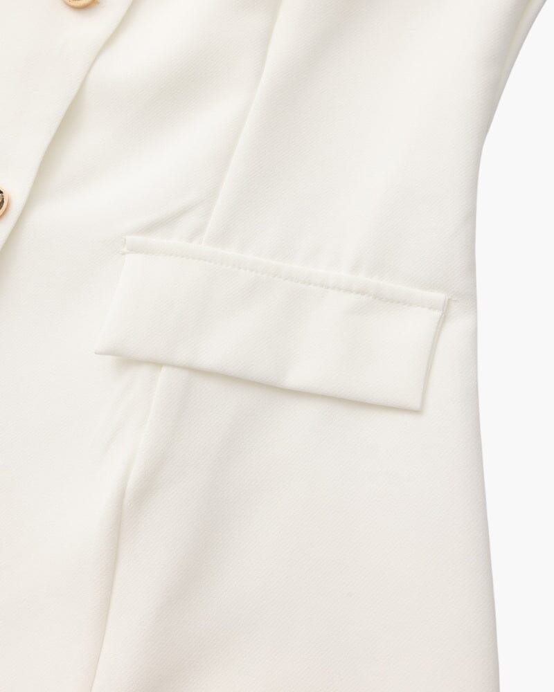 - Sleeveless Blazer Top: Scoop neckline, curved hem, gold button front, and mock flap pockets for structure